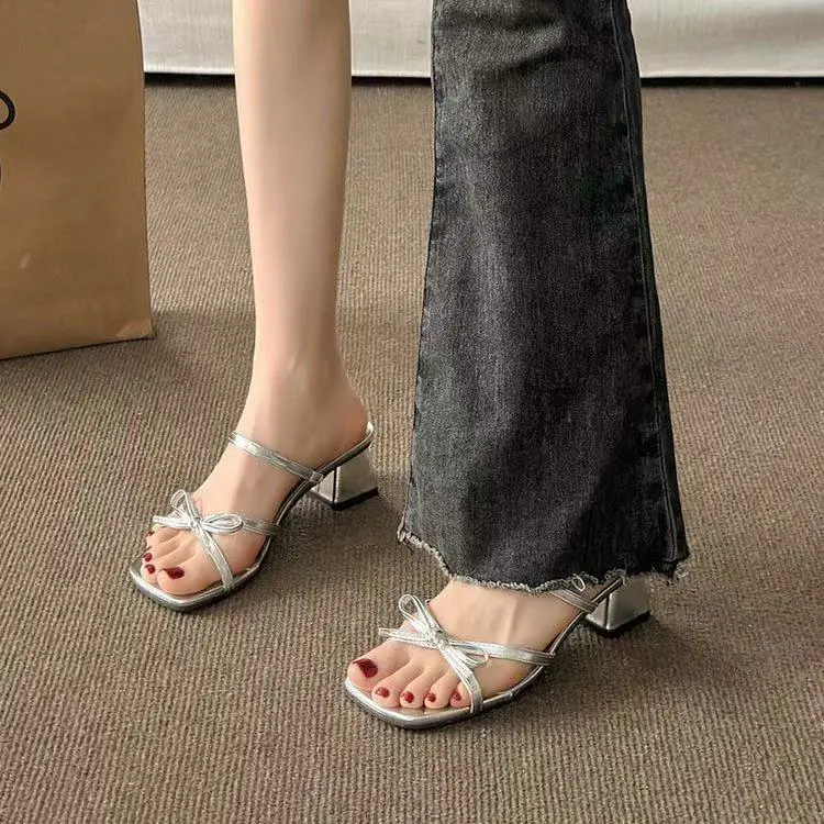 高跟鞋女外穿2025夏季新款百搭小众法式时尚蝴蝶结粗跟拖鞋女凉鞋