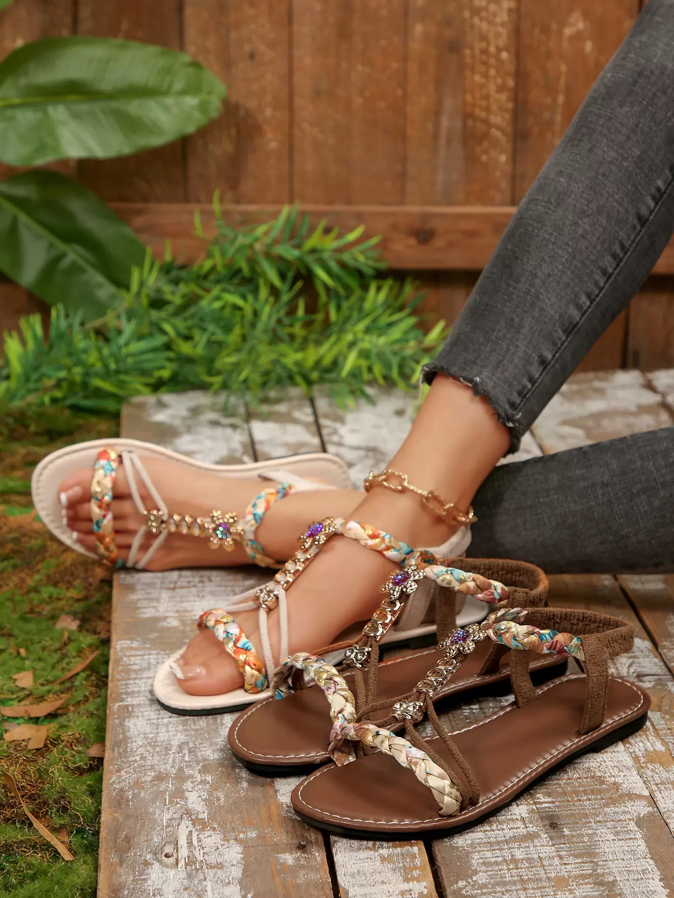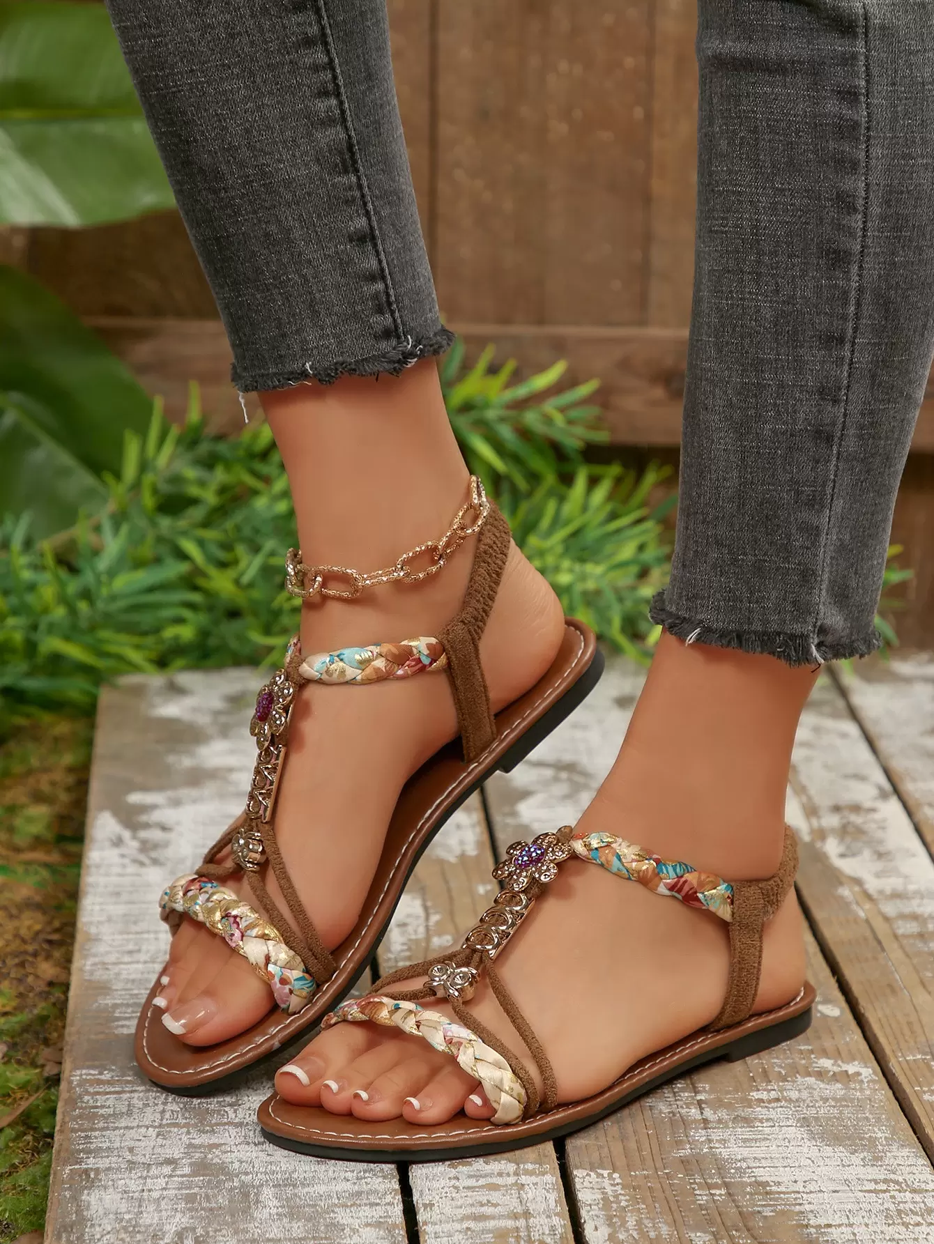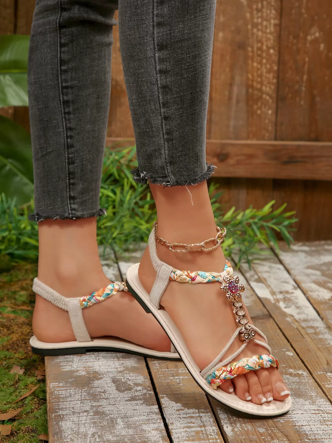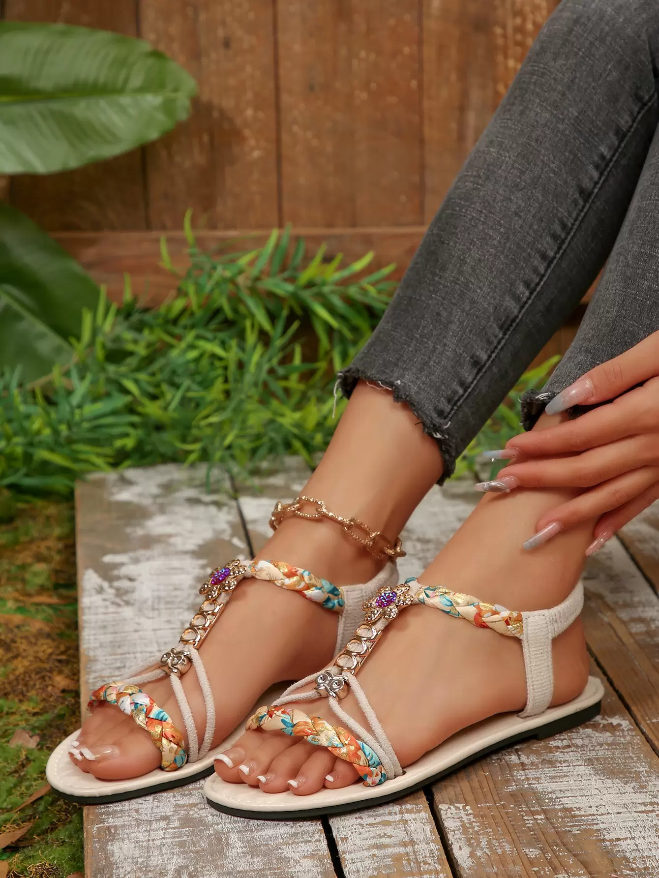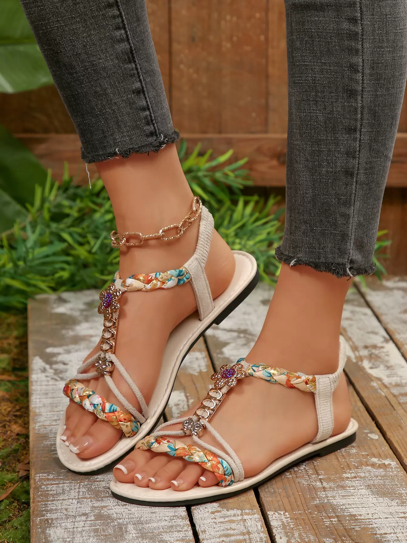 Colorful floral woven flat sandals, Bohemian style beach sandals, suitable for vacations and gatherings
