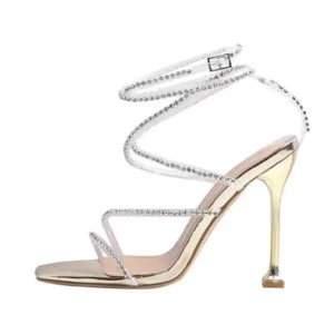 欧美风高跟鞋2025年夏季女鞋细跟高跟露趾水钻绑带凉鞋女鱼嘴设计