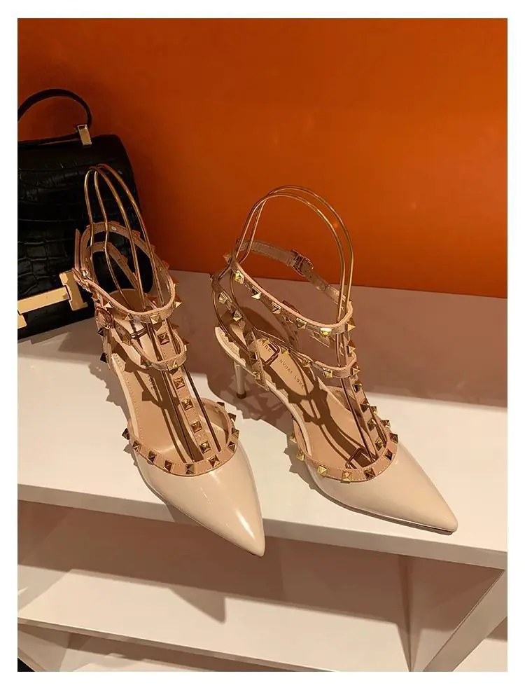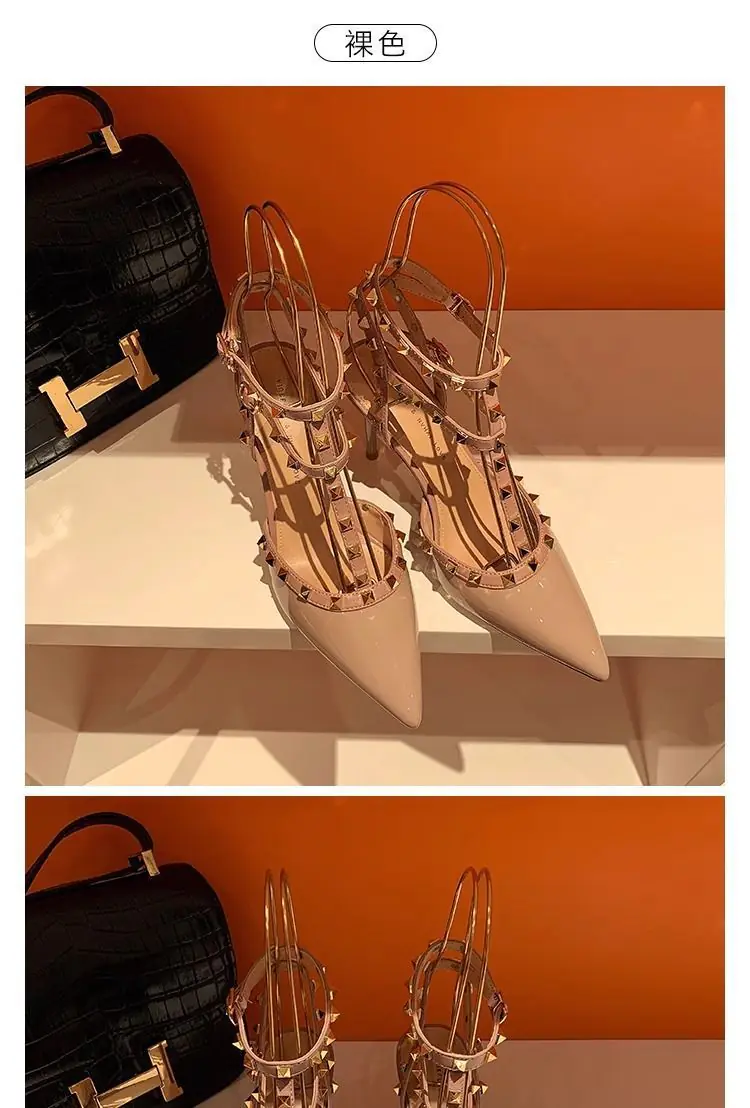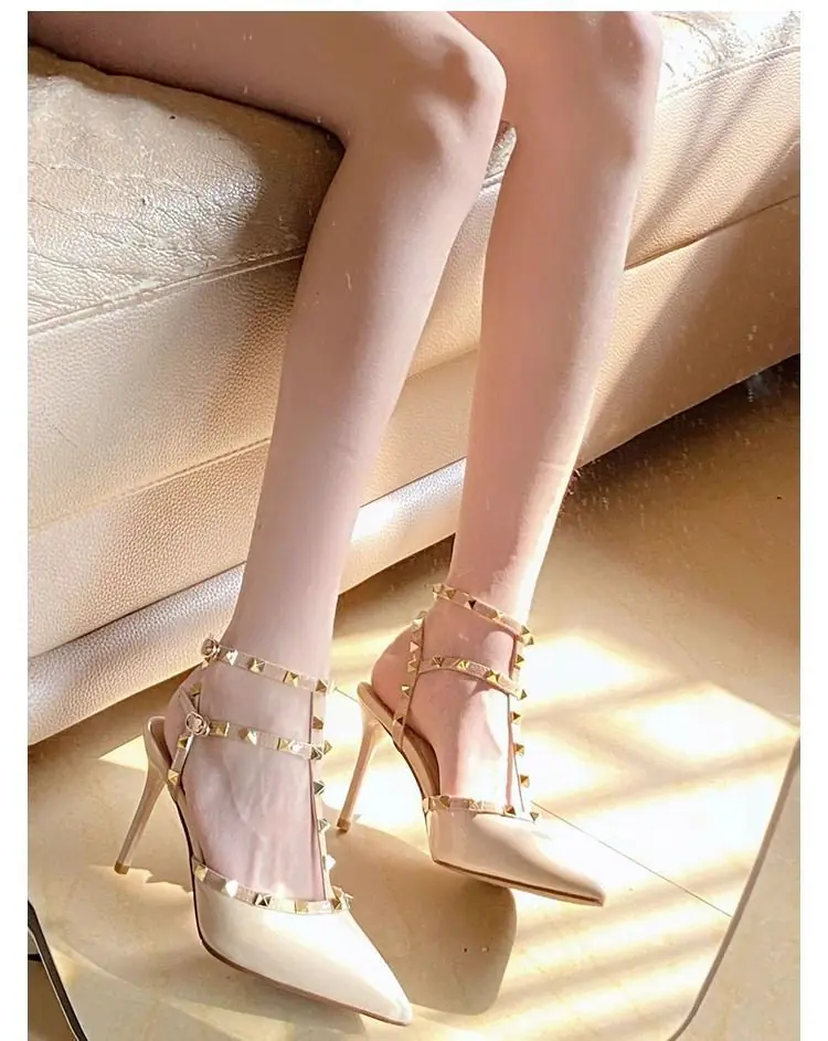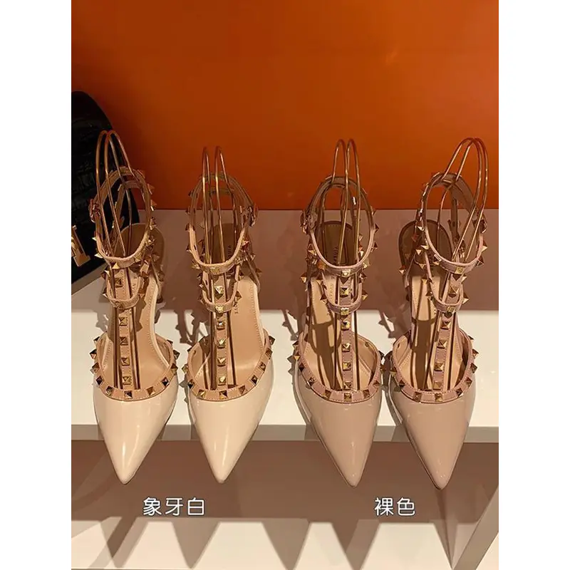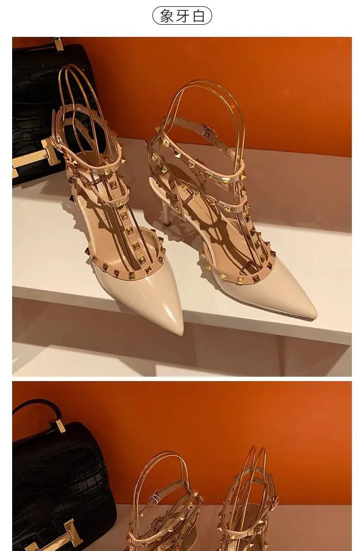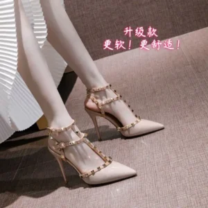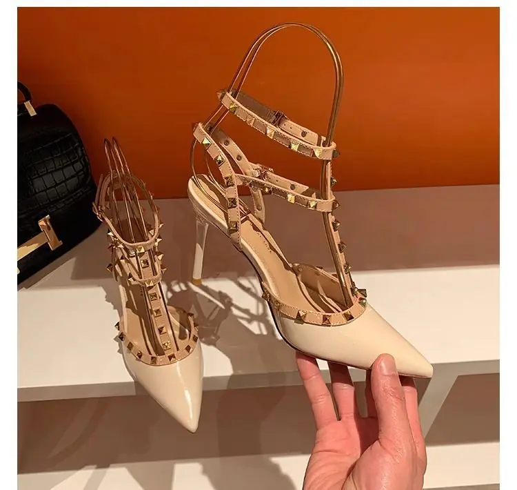 香港铆钉高跟鞋女2025年夏季新款尖头细跟白色柳丁不累脚凉鞋单鞋