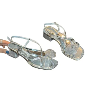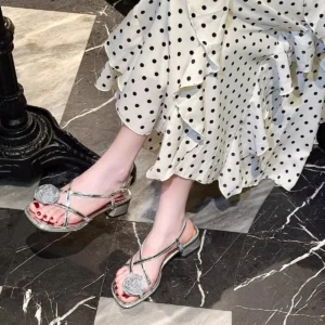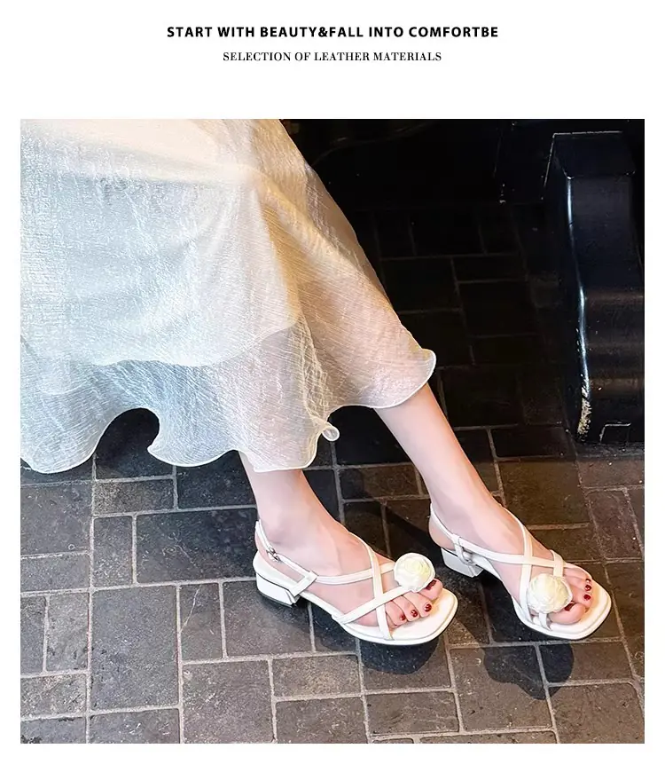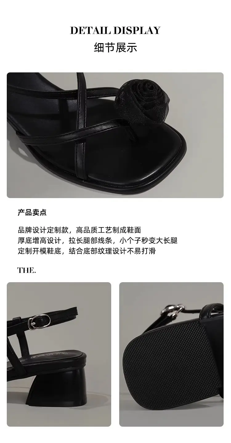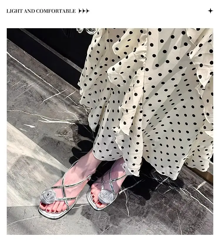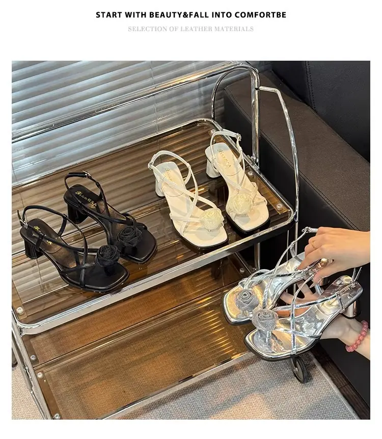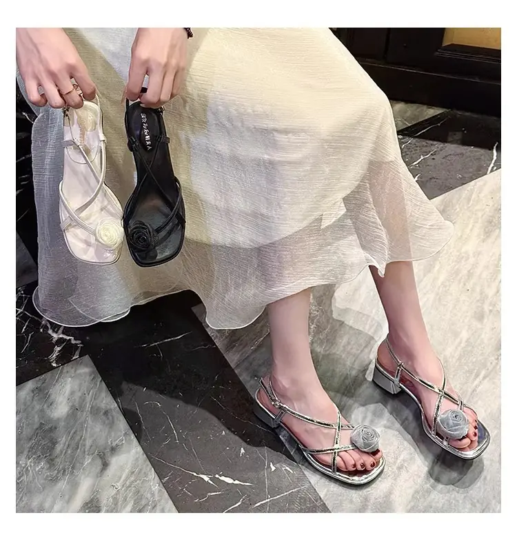 Fairy-Style Rose Flower Toe-Cover Sandals for Women, 2025 Summer New Arrival Chunky Heel Silver Sandals to Match with Dresses, High-Heeled Roman Sandals