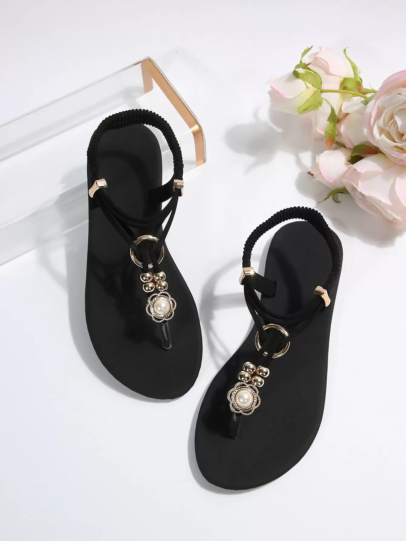 Women’s Cute Pearl and Flower Black Flat Sandals, Black Cross-Ankle Strap Thong Sandals